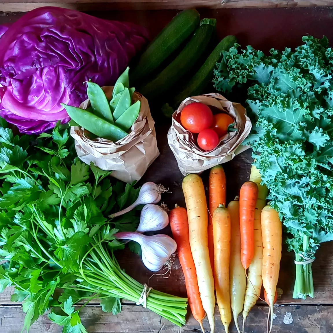 Kassar komponerar vi efter vad som för veckan är fint och moget. I början av säsongen är kassen lite lättare och innehåller härliga primörer och mot slutet av säsongen mer tyngd av fylliga smaker, dock alltid lika stor variation av grödor! Basen är favoriter som rotfrukter, kål, salladsgrönt, tomater och något kryddigt och ibland kan det komma med något mer spännande som till exempel kålrabbi eller minipumpa. Kolla gärna bilder på “VECKANS GRÖNSAKER” på vår facebook eller instagram för att få en uppfattning om innehållet.